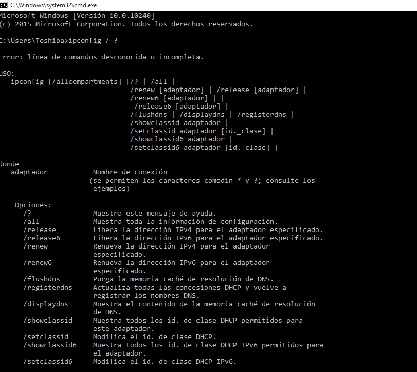 Ejecutando este comando mostrará toda la información que contiene “ipconfig / ? ”