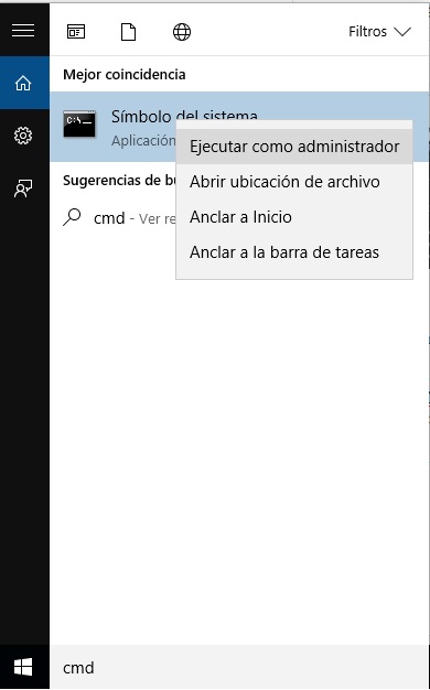 el comando anterior necesita elevación, es decir ejecutarlo con permisos de administrador, para eso necesitamos abrir una ventana de símbolo de sistema y ejecutarla como admin.