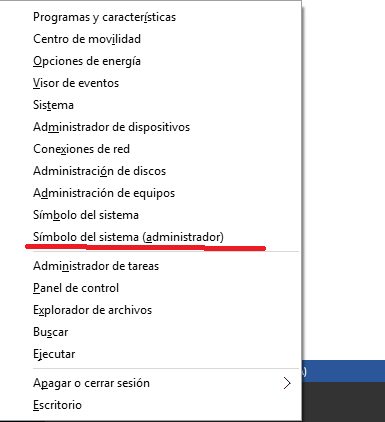 Presionamos las teclas Windows + X, y seleccionamos la opción de Símbolo de Sistema (Administrador) y confirmamos