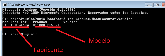 Para saber el fabricante y modelo de motherboard, teclear: wmic baseboard get product,Manufacturer,version