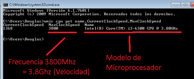 Para saber el modelo de microprocesador, teclear: wmic cpu get name,CurrentClockSpeed,MaxClockSpeed sin comillas y presionar ENTER.
