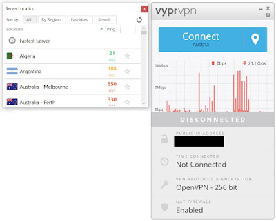 Cuando abre la interfaz por primera vez, muestra su dirección IP actual, el tiempo conectado (desde que acaba de iniciarse, dirá “No conectado”), el protocolo VPN y el cifrado que usará, y si el firewall NAT está habilitado. En la parte superior también hay un gráfico de ancho de banda para mostrar la actividad actual de su conexión. No hay nada particularmente único sobre la interfaz. Muchas VPN muestran su dirección IP, tiempo conectado, etc. Pero el enfoque de VyprVPN está diseñado para que sean fácilmente legibles a través de una combinación de la fuente y el espacio alrededor de cada elemento.