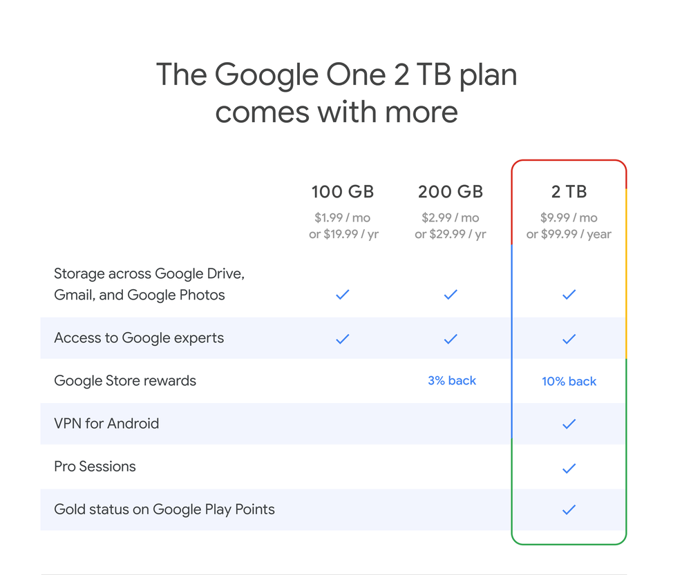 la VPN de Google a planes de 100 o 200 GB que comienzan en $ 1.99 / mes. Para